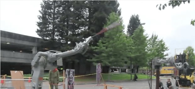 This video was from a talk I gave at Hackers v26 in 2010. I talked about re-coding a Motoman an industrial robot Mark Pauline got. It was used in a movie with Ben Affleck and then at a company that made prosthetic elbows. The robot was outfitted with cadaver arms to test wear and tear on the prosthetics. Now it’s part of the SRL arsenal. There was still a program loaded onto its memory called SAWBONE.
